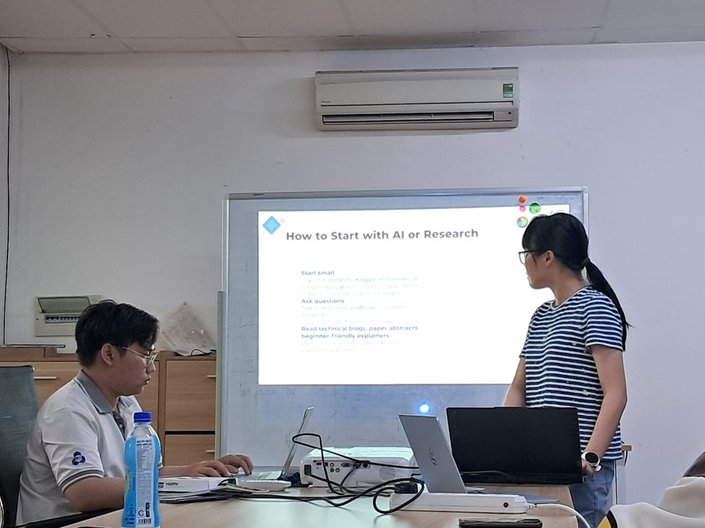 On the afternoon of July 16th, 2025, at the VNPT Lab, members of URA group had the opportunity to meet and talk with Ms. Trần Ngọc Oanh, an HCMUT alumna who is currently a Research Assistant at VinUni. Although it was just a small sharing session, what Ms. Oanh brought was incredibly insightful and inspiring.